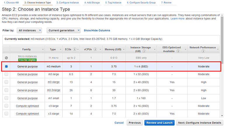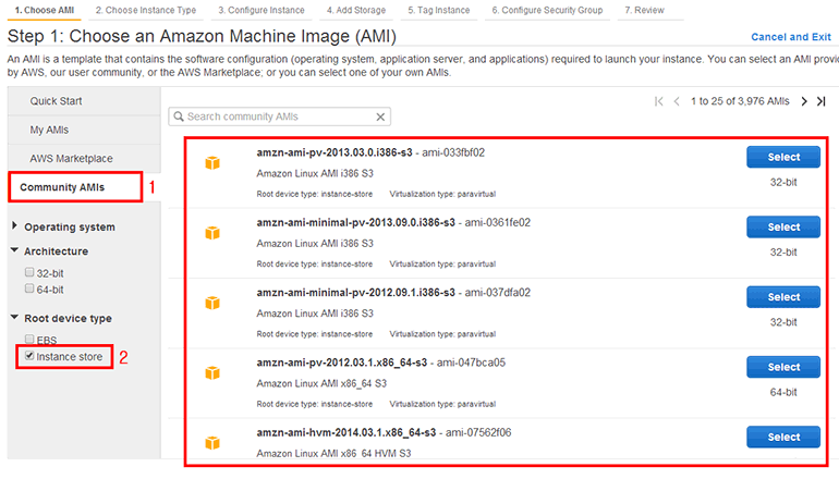 EC2 인스턴스 목록(INSTANCES → Instances)에서 Launch Instance 버튼을 클릭합니다. AMI를 선택하는 페이지에서 Community AMIs를 클릭하고 Instance store에 체크합니다. AMI 목록에 인스턴스 스토리지를 Root 장치로 사용하는 AMI 목록이 표시됩니다. 여기서 최신 버전을 선택하여 EC2 인스턴스를 생성하면 됩니다(hvm보다는 paravirtual이 성능이 더 좋습니다).