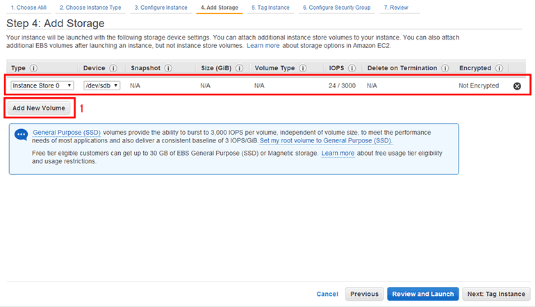 기본적으로 장착된 스토리지가 하나도 없습니다. Add New Volume 버튼을 클릭하여 인스턴스 스토리지를 추가합니다.