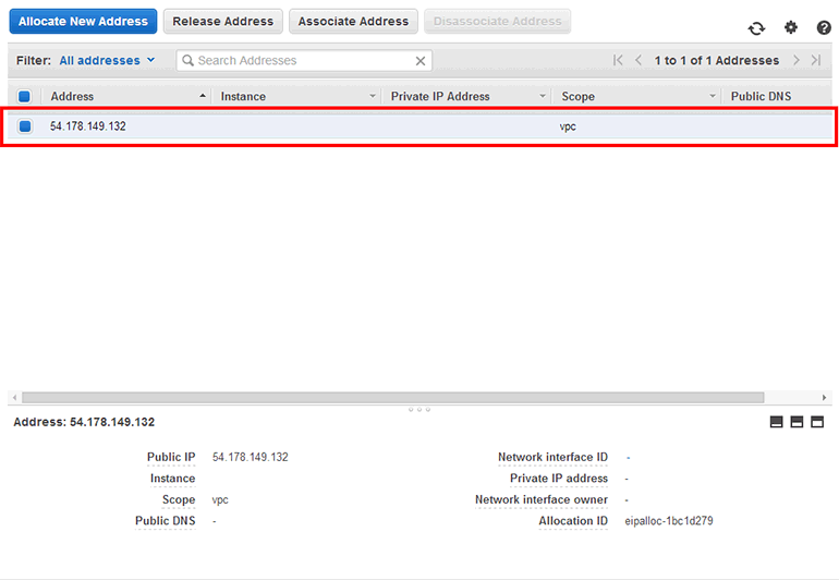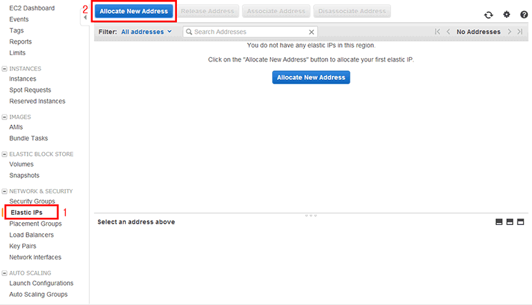 이제 Elastic IP를 하나 할당받아보겠습니다. AWS 콘솔의 EC2 페이지에서 왼쪽 NETWORK & SECURITY → Elastic IPs를 클릭합니다. Allocate New Address 버튼을 클릭합니다.