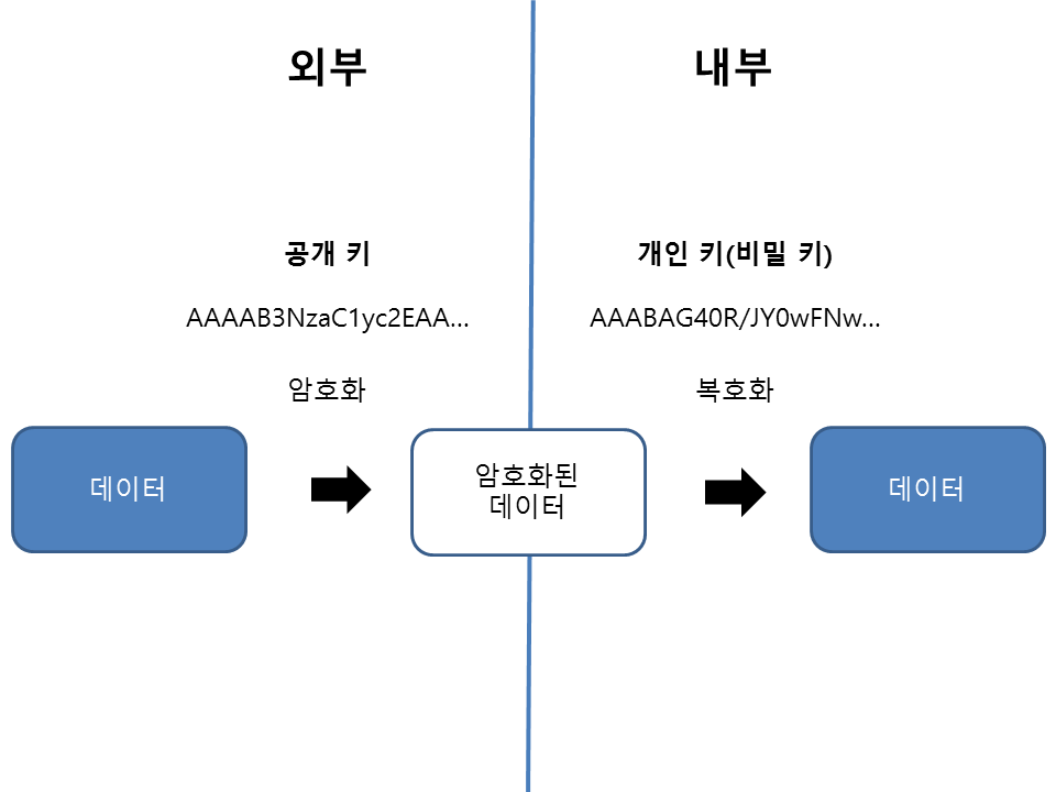 암호화 방식에는 두 가지가 있는데 대칭 키와 공개 키 방식 대표적입니다. 대칭 키 방식은 암호화Encryption하는 키와 복호화Decryption하는 키가 동일하여 이 대칭 키를 상대방에게 전달하는 구간에서 키가 노출되는 단점이 있습니다. 공개 키 방식은 이러한 단점을 개선하여 암호화하는 키와 복호화하는 키를 다르게 설계했고, 암호화 하는 키는 공개 키라고 하여 외부에 노출되어도 안전합니다. 공개 키에서 복호화에 필요한 비밀 키 혹은 개인 키Private Key를 추출하는 것은 매우 어렵습니다.