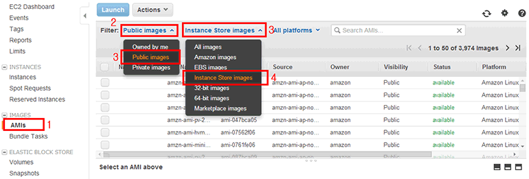 AMI 목록에서도 인스턴스 스토리지를 Root 장치로 사용하는 EC2 인스턴스를 생성할 수 있습니다. AMI 목록(IMAGES → AMIs)의 Filter에서 Public images, Instance Store images를 차례로 선택합니다.
