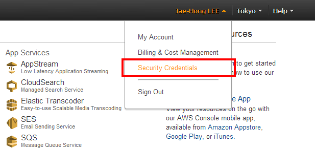 AWS 콘솔의 위쪽에 자신의 이름이 표시된 부분을 클릭하면 메뉴가 나옵니다. 여기서 Security Credentials를 클릭합니다.
