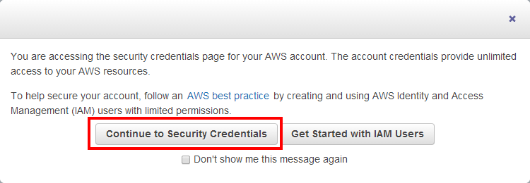 Continue to Security Credentials 버튼을 클릭합니다.