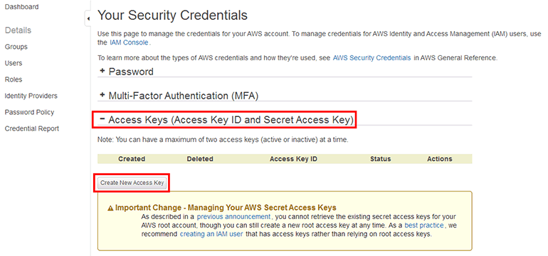 Security Credentials 화면이 나왔습니다. 여기서 Access Keys(Access Key ID and Secret Access Key)의 맨 앞에 위치한 +버튼을 클릭합니다. 그리고 Create New Access Key 버튼을 클릭합니다.