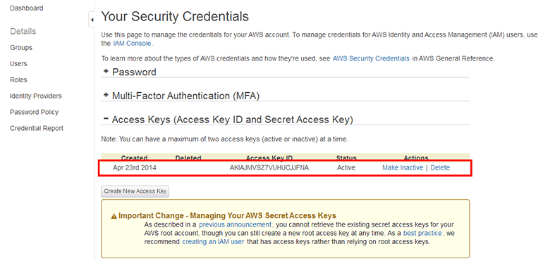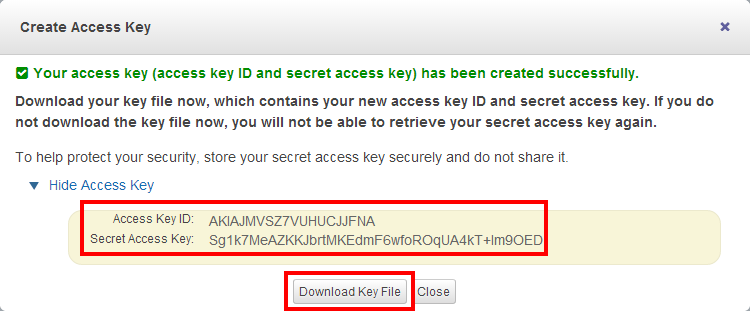 여기서 액세스 키와 시크릿 키를 따로 복사하여 보관하지 않거나, Download Key File 버튼을 클릭하여 파일을 받지 않고 그냥 Close 버튼을 클릭하여 창을 닫아버리면 두 번 다시 시크릿 키를 확인할 수 없게 됩니다(시크릿 키는 일종의 비밀번호입니다). 따라서 생성된 직후 키들을 복사하여 보관하거나 파일을 꼭 받아두어야 합니다.