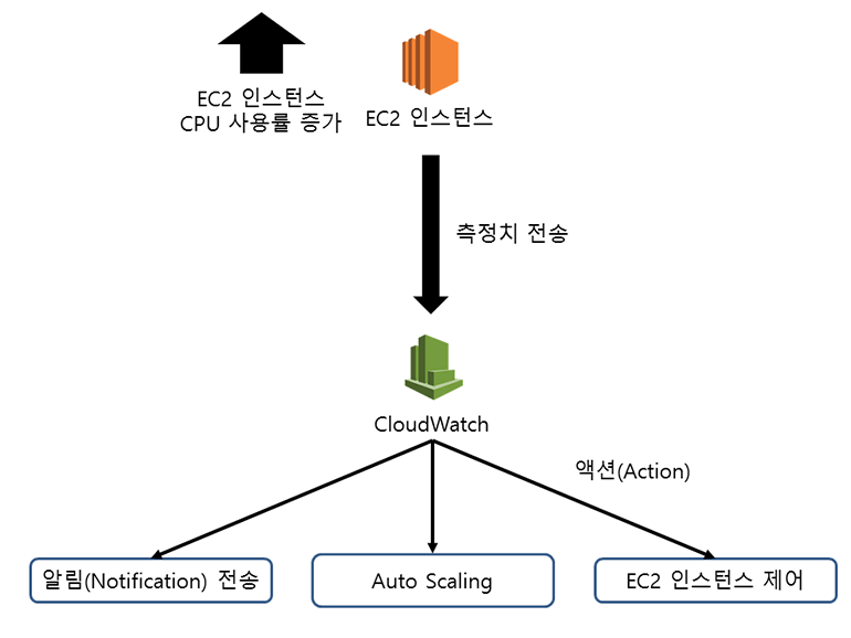 CloudWatch는 AWS 리소스의 상태를 모니터링 하는 서비스입니다. 모니터링뿐만 아니라 측정치Metric와 연계하여 다양한 액션Action을 사용할 수 있습니다.