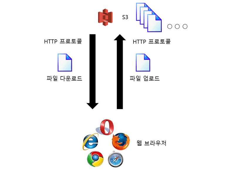 S3은 요즘 흔히 볼 수 있는 웹하드 서비스와 비슷하다고 볼 수 있습니다. 하지만 웹하드 서비스와 S3은 큰 차이점이 있습니다. 웹하드 서비스는 별도의 클라이언트를 설치하거나 ActiveX를 통하여 파일을 업로드/다운로드해야 하지만 S3은 파일 업로드/다운로드를 모두 HTTP 프로토콜로 처리합니다. 따라서 별도의 클라이언트나 ActiveX 설치 없이 웹 브라우저에서 바로 사용할 수 있습니다. 또한, 앞서 설명한 것처럼 S3 자체로 정적 웹 서비스가 가능한 것도 큰 특징입니다.