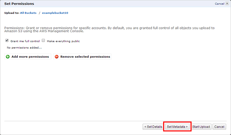 아래 Set Metadata 버튼을 클릭합니다. 권한 설정 방법은 뒤에서 자세히 알아보겠습니다.