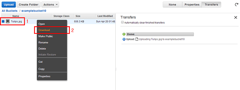 S3 객체 목록에서 파일을 선택하고 마우스 오른쪽 버튼을 클릭하면 팝업 메뉴가 나옵니다(위쪽 Actions 버튼을 클릭해도 같은 메뉴가 나옵니다). Download를 클릭합니다.