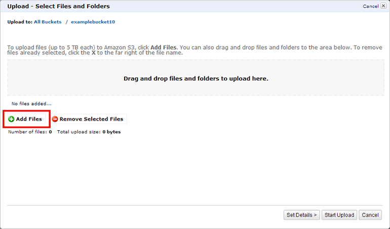 Add Files 버튼을 클릭합니다(Drag and drop files and folders to upload here 부분에 파일을 드래그 & 드롭으로 옮겨도 됩니다).
