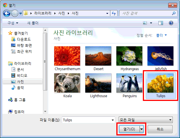 컴퓨터 안에 있는 아무 그림 파일이나 선택하고, 열기 버튼을 클릭합니다.