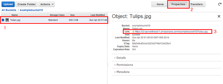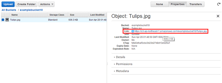 S3에 올라간 파일을 객체라고 표현합니다. S3에서는 이 객체마다 각각의 접근 권한을 설정할 수 있습니다. 가장 간단한 예제로 S3에 올린 파일을 인터넷에 공개해보겠습니다. S3 버킷의 객체 목록에서 파일을 선택하고 위쪽의 Properties 버튼을 클릭하면 그림 11-17과 같이 객체의 세부 내용이 표시됩니다(파일을 선택하고 마우스 오른쪽 버튼을 클릭해서 나오는 팝업 메뉴에도 Properties가 있습니다). 여기서 Link 부분을 보면 그림 파일의 URL이 표시됩니다. 이 링크를 클릭합니다.