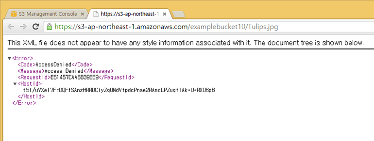웹 브라우저의 새 창이 열리고 링크의 내용이 표시됩니다. 하지만 AccessDenied라는 에러가 표시되고 그림 파일은 열리지 않습니다.