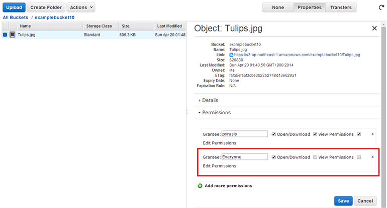이미 파일을 올렸다면 S3 객체 목록은 파일을 여러 개 선택할 수 있으므로 공개하고자 하는 파일을 모두 선택한 뒤 Make Public으로 설정해주면 됩니다. 방금 공개한 그림 파일을 선택하고 Properties 버튼을 클릭한 뒤 Permissions 탭을 클릭합니다. Grantee에 Everyone이 설정되어 있고 Open/Download가 체크되어 있는 것을 볼 수 있습니다. 이것은 Make Public을 실행하면 자동으로 설정됩니다.