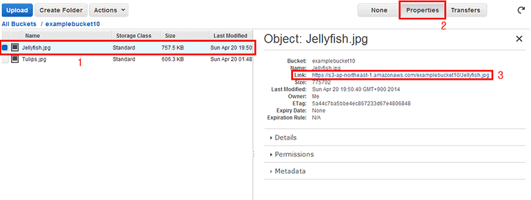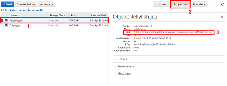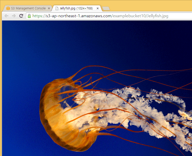 '11.2 S3 버킷에 파일 올리기/받기'를 참조하여 버킷에 그림 파일을 하나 더 올립니다. 저는 Jellyfish.jpg라는 그림 파일을 새로 올렸습니다. 새로 올린 파일을 선택하고 위쪽의 Properties 버튼을 클릭합니다. Link 부분을 보면 URL의 아이콘이 노란색 자물쇠 모양인 것을 확인할 수 있습니다. 이 링크를 클릭합니다.