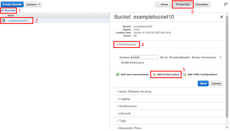 위쪽의 All Bucket을 클릭하면 모든 버킷의 목록이 표시됩니다. 버킷을 선택하고 위쪽의 Properties 버튼클 클릭한 뒤 Permissions 탭을 클릭합니다. 그리고 Add bucket policy 버튼을 클릭합니다(버킷을 선택하고 마우스 오른쪽 버튼을 클릭하면 나오는 팝업 메뉴에도 Properties가 있습니다).