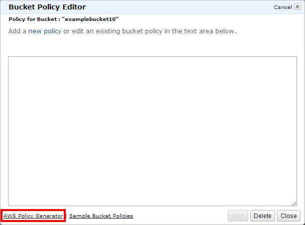 버킷 정책 편집기Bucket Policy Editor가 표시됩니다. 이곳에 JSONJavaScript Object Notation 형태의 정책을 입력하면 됩니다. 이 정책은 다소 복잡하기 때문에 AWS에서는 이 정책을 생성해주는 페이지를 제공하고 있습니다. 아래쪽 AWS Policy Generator 링크를 클릭합니다.