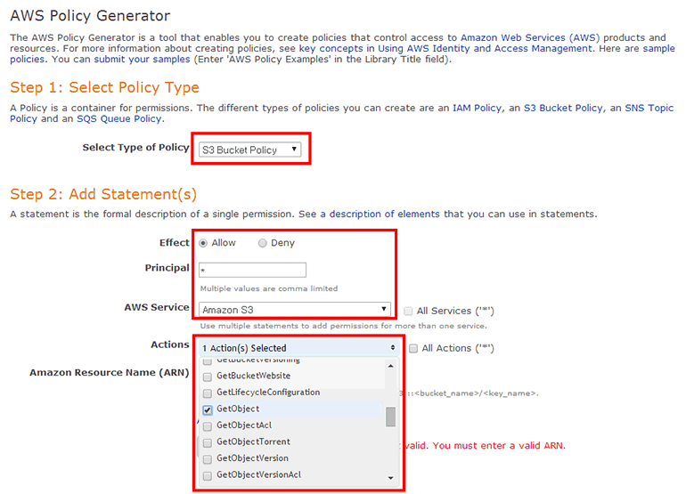 - Actions: S3의 모든 액션이 표시됩니다. 우리는 파일을 받는 액션만 사용할 것이므로 GetObject를 선택합니다.