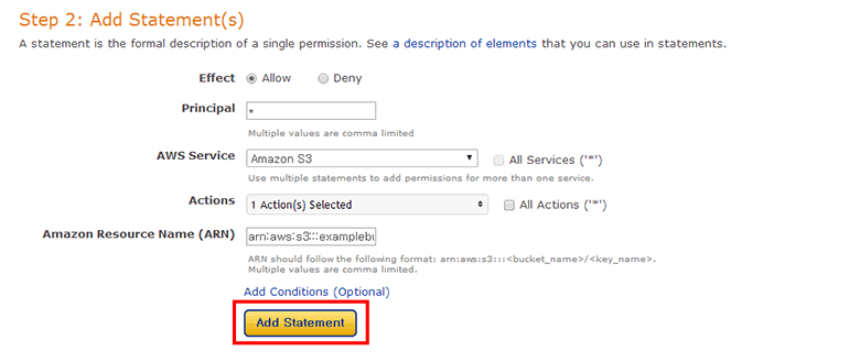 - Principal: 권한을 적용할 사용자입니다. IAM 계정을 사용할 수 있습니다. 여기서는 인터넷에 전체 공개할 것이므로 *을 입력합니다.