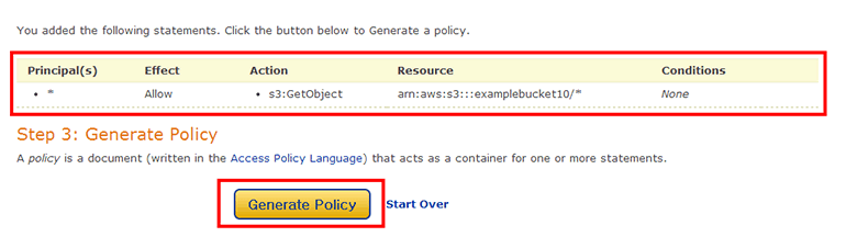 설정한 내용이 Statements 목록에 추가되었습니다. 아래쪽 Generate Policy 버튼을 클릭합니다.