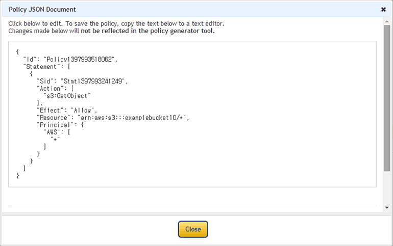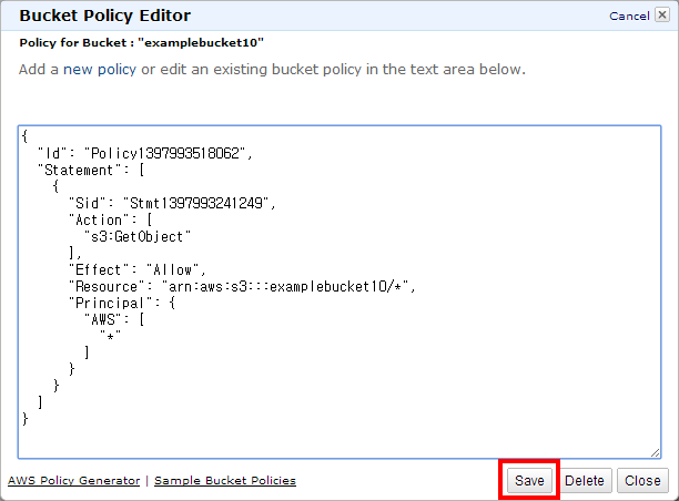 이제 다시 버킷 정책 편집기Bucket Policy Editor에 방금 AWS Policy Generator에서 복사한 JSON 텍스트를 붙여넣습니다. 붙여넣기가 완료되었다면 아래쪽 Save 버튼을 클릭합니다.