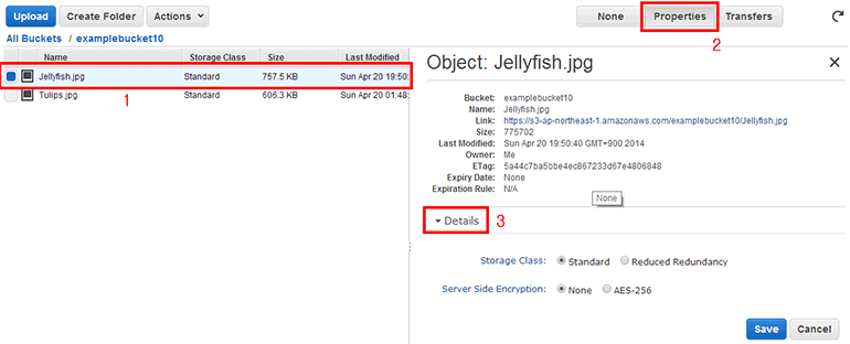 S3 객체 목록에서 파일을 선택한 뒤 위쪽 Properties 버튼을 클릭합니다. 그리고 Details 탭을 클릭합니다.