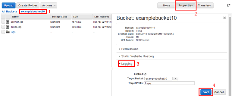 S3에 저장된 객체의 접속 로그Logging를 텍스트 파일 형태로 저장할 수 있습니다. 이제 버킷의 Properties 설정하는 것에 익숙해졌을 것입니다. 버킷의 Properties에서 Logging 탭을 클릭합니다.