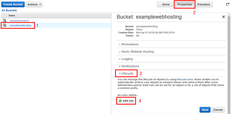 S3 버킷 목록에서 버킷을 선택하고 위쪽 Properties 버튼을 클릭합니다. 그리고 Lifecycle 탭을 클릭합니다. 여기서 수명 주기 규칙Lifecycle Rule을 추가할 수 있습니다. Add rule 버튼을 클릭합니다.
