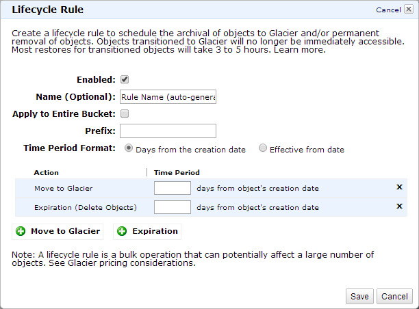 • Move to Glacier: 설정한 날짜에 데이터를 보관 및 백업 전용 스토리지인 Glacier로 이전합니다. Glacier에 관해서는 '21장 데이터 보관 및 백업을 위한 매우 저렴한 스토리지 서비스 Glacier'를 참조하기 바랍니다.