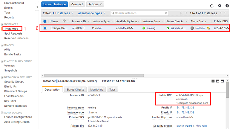 EC2 인스턴스 목록(INSTANCES → Instances)에서 EC2 인스턴스(Example Server)를 선택합니다. 아래 Description에서 Public DNS 부분이 이 EC2 인스턴스의 주소입니다.