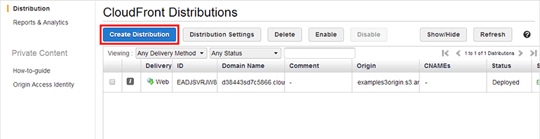 이제 CloudFront 배포 목록으로 이동하여 위쪽 Create Distribution 버튼을 클릭합니다.