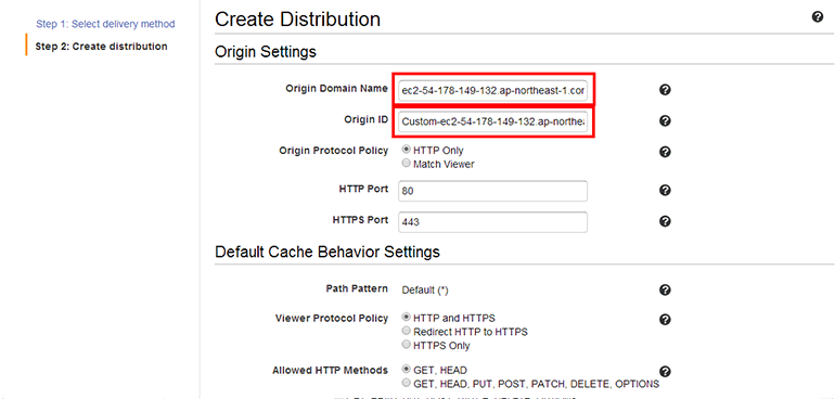 • Origin Domain Name: 커스텀 오리진을 사용하려면 이곳에 오리진 서버의 도메인을 설정하면 됩니다. EC2 인스턴스(Example Server)의 Public DNS를 입력합니다(예: ec2-54-178-149-132.ap-northeast-1.compute.amazonaws.com).