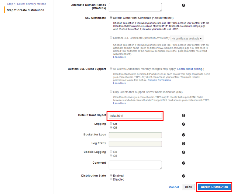 • Distribution State: 배포를 생성한 뒤 배포 상태 설정입니다. Enabled로 설정하면 곧바로 사용할 수 있는 상태가 되며 Disabled로 설정하면 그냥 배포만 생성하고 비활성화 상태로 둡니다. 기본값 그대로 사용합니다.
