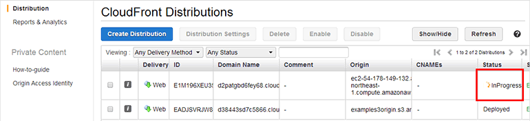 그림 12-27 CloudFront 배포 생성 완료, 전파 중