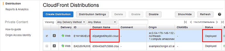 모든 에지 로케이션에 전파가 완료되면 Status가 Deployed로 바뀝니다. Domain Name에 CloudFront 배포의 도메인이 표시됩니다. CloudFront 배포 도메인 형태는 http://d2patgbd6fey68.cloudfront.net이며 앞의 d2patgbd6fey68 부분은 배포를 생성할 때마다 바뀝니다.