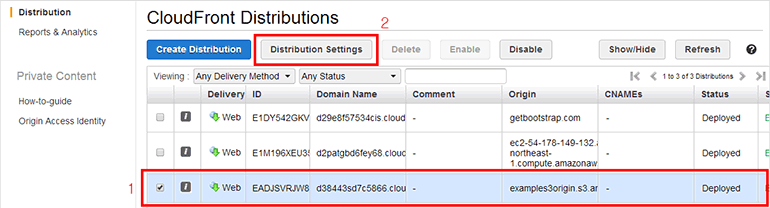 CloudFront 배포 목록에서 S3와 연동한 CloudFront 배포를 선택합니다. 그리고 위쪽 Distribution Settings 버튼을 클릭합니다.