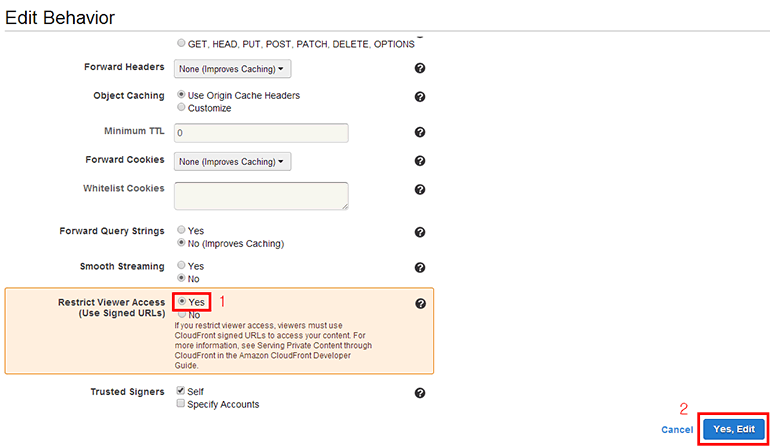 - Restrict Viewer Access: Yes를 선택하여 Signed URL을 사용합니다.