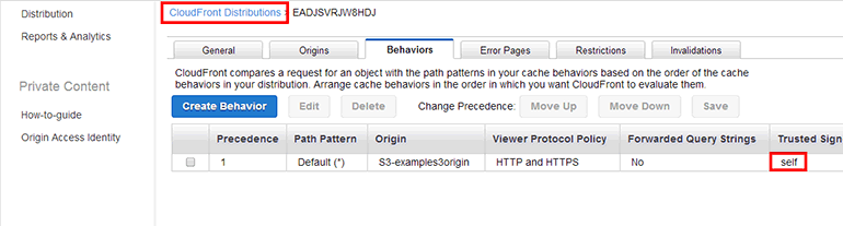 CloudFront 배포 Behavior 목록에서 Trusted Signers가 self로 설정되었습니다. 이제 위쪽 CloudFront Distributions를 클릭합니다.