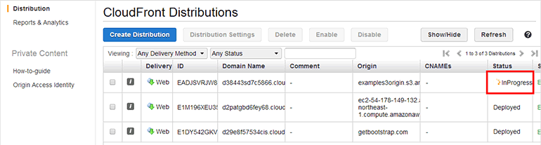Status를 보면 InProgress로 표시되며 인디케이터가 회전하고 있습니다. CloudFront 배포를 생성했을 때와 마찬가지로, 배포의 설정이 모든 에지 로케이션에 전파되기까지 약 15~20분이 소요됩니다.