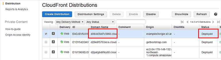 설정이 모든 에지 로케이션에 전파가 완료되면 Status가 Deployed로 바뀝니다. Domain Name에 CloudFront 배포의 도메인이 표시됩니다.
