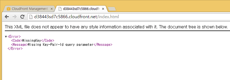 웹 브라우저에서 Signed URL을 설정한 CloudFront의 index.html 파일에 접속합니다. MissingKey라는 에러가 발생하면서 index.html 파일의 내용이 표시되지 않습니다. 이제 Signed URL에 맞는 파라미터들이 없으면 파일의 내용을 볼 수 없습니다.