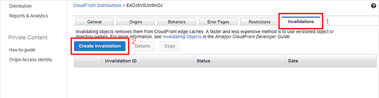 CloudFront 배포 설정입니다. 위쪽 Invalidations 탭을 클릭하고 Create Invalidation 버튼을 클릭합니다.