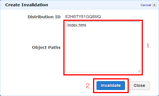 Create Invalidation 창이 표시됩니다. 여기서 무효화Invalidation 요청을 생성합니다.