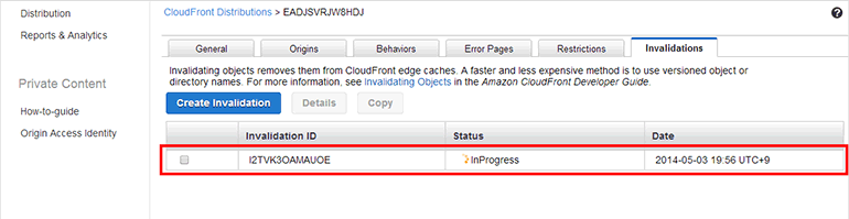 무효화 요청 목록에서 무효화 요청이 생성된 것을 확인할 수 있습니다. Status를 보면 InProgress로 표시되며 인디케이터가 회전하고 있습니다. 무효화 요청이 모든 에지 로케이션에 적용되기까지 약 15~20분이 소요됩니다.