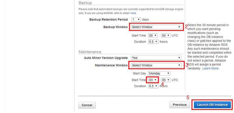- Maintenance Window: 점검 시간입니다. 기본값은 No Preference입니다. 여기서는 Select Window를 선택하고 Start Day를 Monday, Start Time을 03:00, Duration을 0.5로 설정합니다. UTC 기준으로 03시 00분에 점검이 시작되며 시간은 0.5시간(30분)입니다. Duration을 설정하는 이유는 위 Backup Window의 시간과 겹치지 않게 하기 위해서 입니다. 점검은 Duration에 설정한 시간보다 일찍 끝날 수 있습니다.