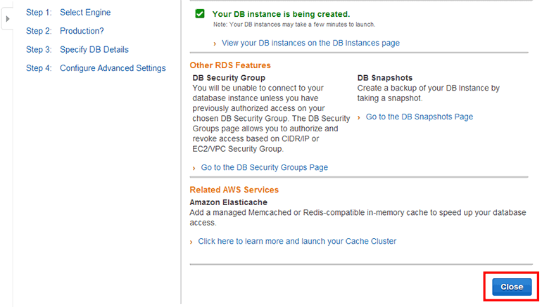 이제 RDS DB 인스턴스 생성이 시작되었습니다. Close 버튼을 클릭합니다.