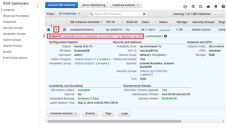RDS DB 인스턴스가 완전히 생성되었으면 exampledbinstance를 선택합니다. 그리고 ▶를 클릭하면 DB 인스턴스의 세부 내용이 표시되며 Endpoint 부분에 exampledbinstance.cnlconsezo7y.ap-northeast-1.rds.amazonaws.com:3306처럼 DB에 접속할 수 있는 주소가 표시됩니다. 이후 이 주소를 통해 DB에 접속하면 됩니다.