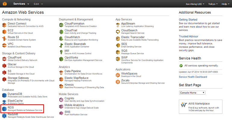 RDS 인스턴스를 생성하고 사용해보겠습니다. 데이터베이스 엔진은 가장 손쉽게 사용할 수 있는 MySQL로 하겠습니다. AWS 콘솔로 접속한 뒤 메인 화면에서 Database의 RDS를 클릭합니다.