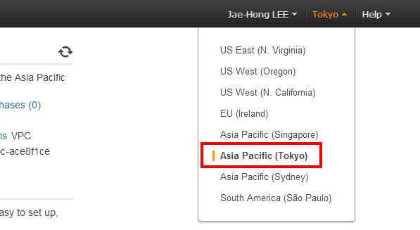오른쪽 위에서 RDS의 리전을 변경할 수 있습니다. 이 책에서는 우리나라에서 가장 가까운 Tokyo 리전을 사용하겠습니다.
