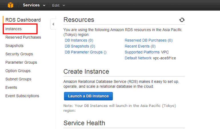 왼쪽 메뉴에서 Instances를 선택합니다. 이 메뉴가 RDS DB 인스턴스 목록이며 생성 한 온 디맨드 인스턴스(On Demand Instance)와 예약 인스턴스(Reserved Instance)의 목록이 표시됩니다.